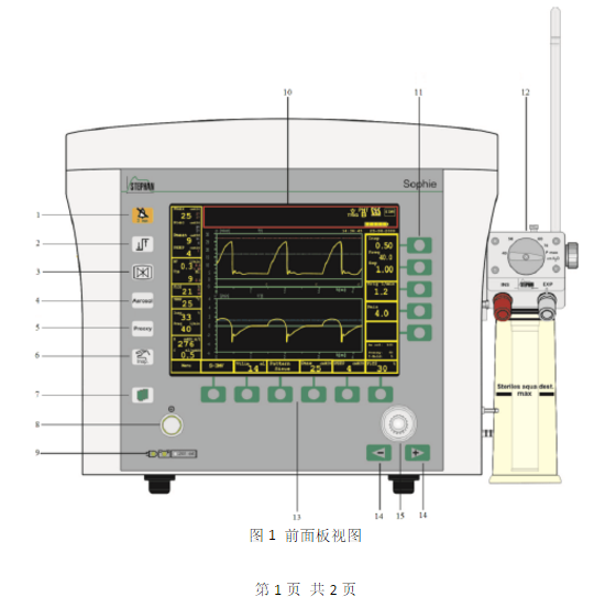 蘇菲新生兒呼吸機必須放置于提供的移動臺車的支架中央。臺車前輪配有剎車,防止蘇菲新生兒呼吸機意外移動。2.1將氧氣管路連接到設(shè)備背面的氧[管道接口和墻上的中央氣源插口中。2.2 用空氣管路連接到設(shè)備背面的空ü管道接口和墻上的中央氣源插口中。1.供電電壓范圍在100-240 VAC范圍內(nèi);2.將病人單元連接到蘇菲新生兒呼吸機右側(cè)面板,并鎖緊固定;5.將Y形接頭、流量傳感器、壓力測量管和溫度探頭分別連接到病人管路和主機上,并將病人管路與Sophie主機可靠連接。6.必須將流量傳感器和Y形接口連接到病人單元背面專用接口:3.2連接電源并打開電源開關(guān),按下開機按鈕啟動蘇菲新生兒幾呼吸機。濕化瓶中注入蒸餾水時,將瓶擰在一起之前水面切勿達到“MAX”標(biāo)記位置,否則濕化管沒入水中后,水面將超過標(biāo)記的最大水量:在操作過程中要經(jīng)常檢查濕化瓶的水位。永遠不要在設(shè)備工作時拆下濕化瓶!包括濕化瓶在內(nèi)的濕化裝置,在設(shè)備工作時,內(nèi)有150cmH;O的壓力!在使用注射器向濕化瓶內(nèi)注水時,需密切注意,防止壓力將注射器活塞反向推出注射器,從而造成危險。在操作過程中,只能使用自動注水系統(tǒng)或帶注射器的鹿耳接頭給濕化瓶注水用冷水填充可能引起“吸入’體溫度過低”和“水浴溫度過低”報警。這些報警可通過關(guān)閉“加熱濕化”菜單的加熱功能大約1秒鐘再打開來抑制。這樣聲音報會被抑制30分鐘不論是進行連接還是斷開操作,都要抓據(jù)病人單元管路的接頭處而非加熱絲查繞處,否則容易損壞加熱絲。3.4系統(tǒng)測試完成時,屏幕上將顯示“Test-mode fiushedSelect ventilation mode ” 然后可選擇相應(yīng)的通氣模式,氧氣傳感器自動校準(zhǔn)。