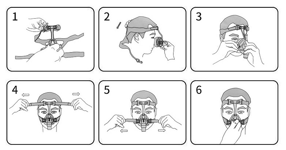 在坐姿時(shí),手扶住面罩貼合面部,然后調(diào)整頭帶,調(diào)整上、下頭帶讓前額墊及面罩輕輕貼合在前額和臉頰上,保持上下頭帶平行。